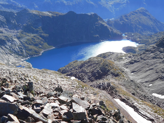 Hem d'abandonar el camí, el GR i la ruta de la "porta del cel" per encarar la pujada a l'esmentat estany Blanc. No hi ha camí, però si algunes fites