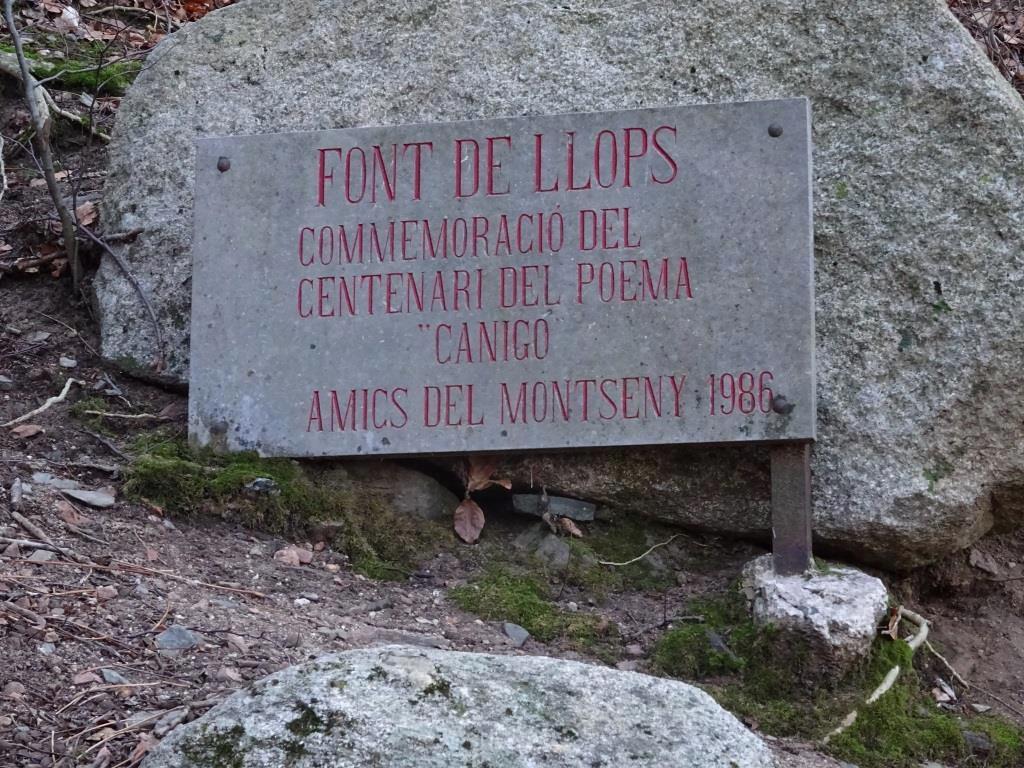 Tornem a la cruïlla i seguim uns metres més i aviat la deixem per a seguir un marcat sender que surt per l’esquerra i seguim baixant fins que arribem a una cruïlla de pistes. S’ha acabat la forta baixada, girem a la dreta i passada una cadena trobem la darrera font de l’excursió. La font dels Llops, situada en una raconada molt bonica en mig d’una espessa fageda; rep el nom pels darrers llops (dues femelles i tres mascles) abatuts al Montseny a finals del segle XIX; restaurada pels Amics del Montseny l’any 1986 i dedicada al centenari del poema Canigó.