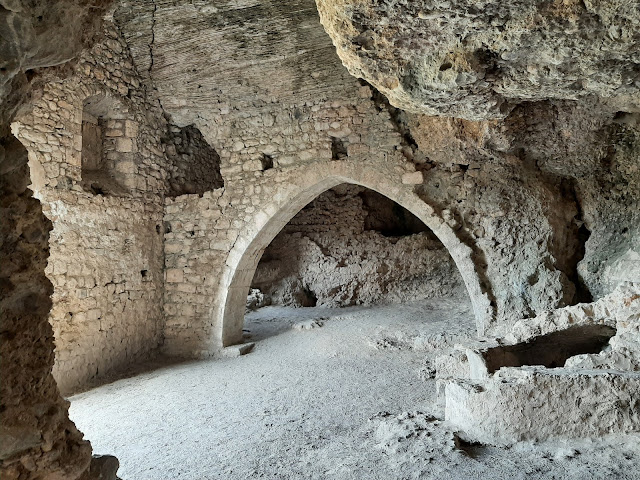 Segurament hi havia dos nivells ja que hi ha els forats de l’encast de la bigues i les finestres enlairades que correspondrien al pis. El recinte està dividit en dos espais amb un arc gòtic que els separa. També hi ha una cisterna que deuria aprofitar un degotall o directament l’aigua de la pluja.