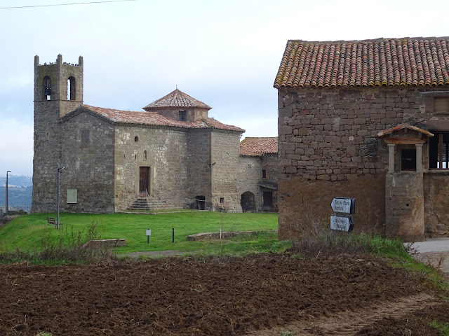 1:45 Sant Joan de Montdarn, 654m. Parada i fonda obligatòria per assaborir aquest indret tan bonic, contemplant l’església, rectoria, les tines i la masia del Cor-de-roure i descansant en un dels bancs que hi ha davant l’església. Si anem a la part del darrera, veurem les tines i si seguim pel camí protegit per una barana arribarem a una petita balma on sembla que hi havia sepultures i des d’on podem contemplar l’absis de l’església.